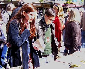 很多市民走到桌子前,与学员交谈并且在制止中共活摘法轮功学员器官的征签簿上签了名。