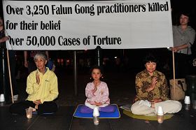 二零一零年四月二十三日傍晚,澳洲悉尼大法弟子聚集在市政厅外的广场上,举行烛光晚会,以此纪念十一周年前的四月二十五日大法弟子到中南海集体上访,同时悼念三千多名被中共迫害去世的大法弟子, 并进一步抗议中共的残暴罪行。