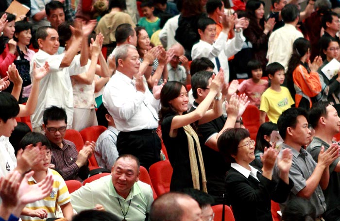 ![]() 神韵在云林县府文化处音乐厅的第三场演出,盛况空前热烈,结束时,观众起立热烈鼓掌向神韵演员致敬 | ![]() 神韵在云林县府文化处音乐厅的第三场演出,满场观众频频为神韵的精彩演出欢呼,掌声如雷。 |