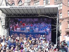 奥运会奖牌获得者在大约十辆车上,穿插在不同团体的游行队伍中,法轮大法天国乐团被安排在金牌获得者之前。