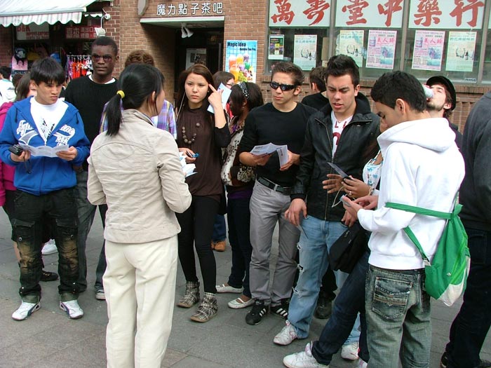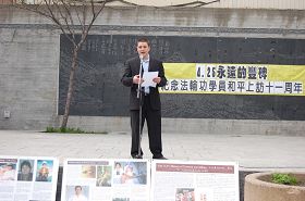 了解真相的人们一批又一批的,许多西方人是第一次听说法轮功的事情,几乎所有人都被中共的邪恶、残暴所震惊,不敢相信会有这样的事情发生。他们希望迫害早日停止。一对来自英语区的夫妇与法轮功学员交谈了大约二十多分钟,详细的了解法轮功和“四·二五”等情况,最后他们说:“我们支持你们的正义行为。”