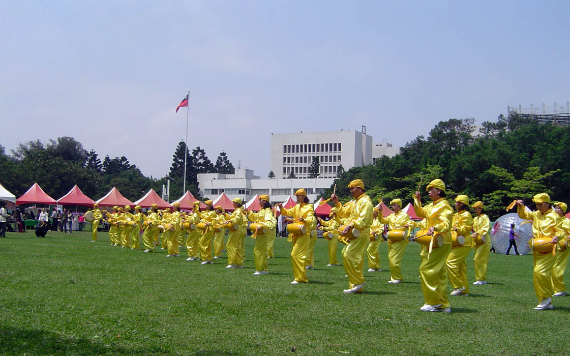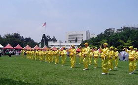 游行队伍到达水木餐厅后,接着,腰鼓队在水木餐厅前的溜冰场表演,再度吸引了不少目光。然后,由一部份功法表演学员展示一至五套功法,在春暖花开时刻,优美的成功湖畔,微风轻抚,法轮功学员舒缓的功法,伴随着悦耳的炼功音乐,场面祥和平静。