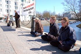 很多路人经过这里都停下了脚步,上前询问发生了什么事情。一对瑞典夫妇跟学员交谈了很久,他们说,我们每年都看到你们在这里,你们做得很对,得知中共对法轮功如此残酷的迫害已经十一个年头了还在继续,他们很是气愤。他们问我们能为你们做点什么来帮助你们?”最后他们表示要告诉更多的瑞典人这场发生在中国对人权的残酷迫害。