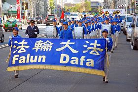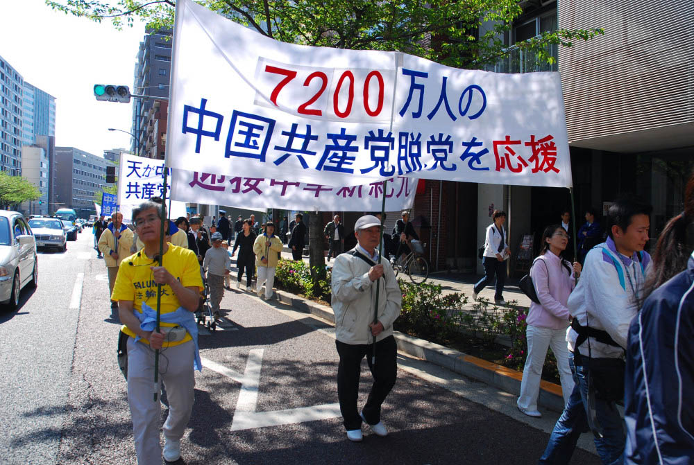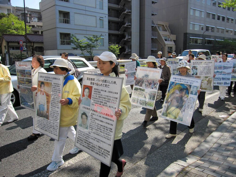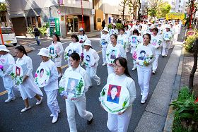 下午两点半左右法轮功学员和部份正义民众开始从惠比寿公园出发到六本木的一个多小时的游行,游行队伍由天国乐团做先导,随后是身着白衣、手捧被迫害致死的法轮功学员遗像的女学员方阵,以及展示法轮功学员遭受残酷迫害照片的看板的队伍,人们手举“纪念四•二五和平上访十一周年,停止迫害法轮功”等中日文横幅,扩音器里反复用日文播送此次活动的目的、什么是法轮功和法轮功遭受迫害的情况,向路人传达真相。游行队伍途经热闹繁华的市中心,引起路人的关注,很多人默默地驻足观看,有人关切地询问,对仅仅因为修炼法轮功竟然遭到残酷迫害的法轮功学员表示同情,对中共的做法表示不解和愤怒。
