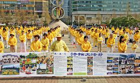 当日下午一时,一百五十多名身穿黄色T恤与米色长裤的法轮功修炼者,在花卉展示场入口开始了集体炼功演示,他们从儿童到白发苍苍的老人,包括了各个年龄层。游览湖水公园的很多观众,被这种祥和优美的集体炼功场面所吸引。