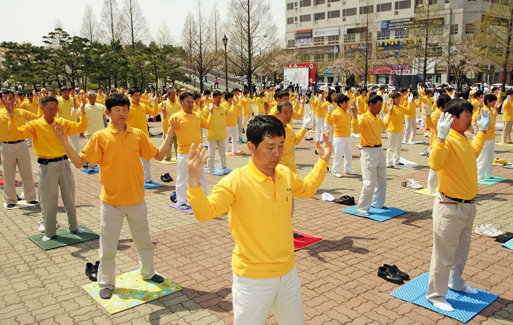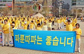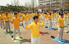 湖水公园正在举办韩国花卉博览会,且当天正逢周日,蜂拥而来的各地游客被法轮功学员的集体炼功场面吸引。