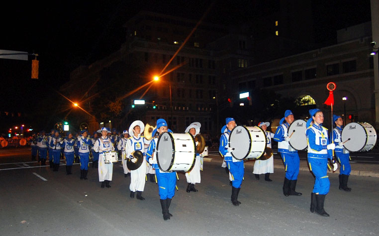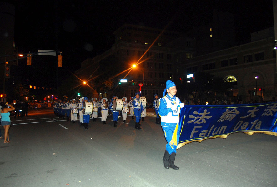 【明慧网二零一零年四月三十日】(明慧记者曾洪德州报道)二零一零年四月二十四日晚七点四十五分,美国最盛大的夜间灯光游行、一年一度著名的灯火节(Fiesta Flambeau)大游行,在德州圣•安东尼奥市中心的百老汇大道上拉开了序幕。由德州法轮功学员组成的天国乐团是其中唯一的亚裔团体,他们独特的服装、整齐的步伐、嘹亮的音乐声、祥和的仪容备受人们欢迎,所到之处赢得热烈掌声。