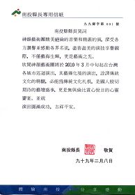 【明慧网二零一零年四月七日】(明慧记者夏昀彰化综合报导)暌违一年,“世界第一秀”神韵晚会再临台湾彰化。去年神韵在台巡演的完美句点,在彰化员林演艺厅加演两场而划下。二零一零年四月六日,神韵彰化首场也在满场观众的热切掌声中拉开帷幕。开演前夕,天空突然降下甘霖,抒解中台湾久旱不雨的困境。现场汇聚政商界、艺文界、教育界人士,更有神韵的忠实爱好者由外县市而来。中华文化五千文明,在神韵艺术团的演绎下,再现辉煌,纯善纯美的演出,为繁忙的人心注入一股清泉。