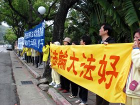 【明慧网二零一零年四月八日】二零一零年四月七日下午,为了呼吁社会各界共同制止中共迫害法轮功,台湾法轮功学员在访问台湾的上海市长韩正前往故宫必经之路高举制止迫害横幅。台湾法轮大法学会理事长张清溪表示,上海市是中国最大、最发达的城市,也是中共迫害法轮功最严重的城市之一,台湾的法轮功学员也曾在上海遭到迫害,希望韩正借此行认识到中共迫害法轮功而所犯下的罪行,将受法律制裁。
