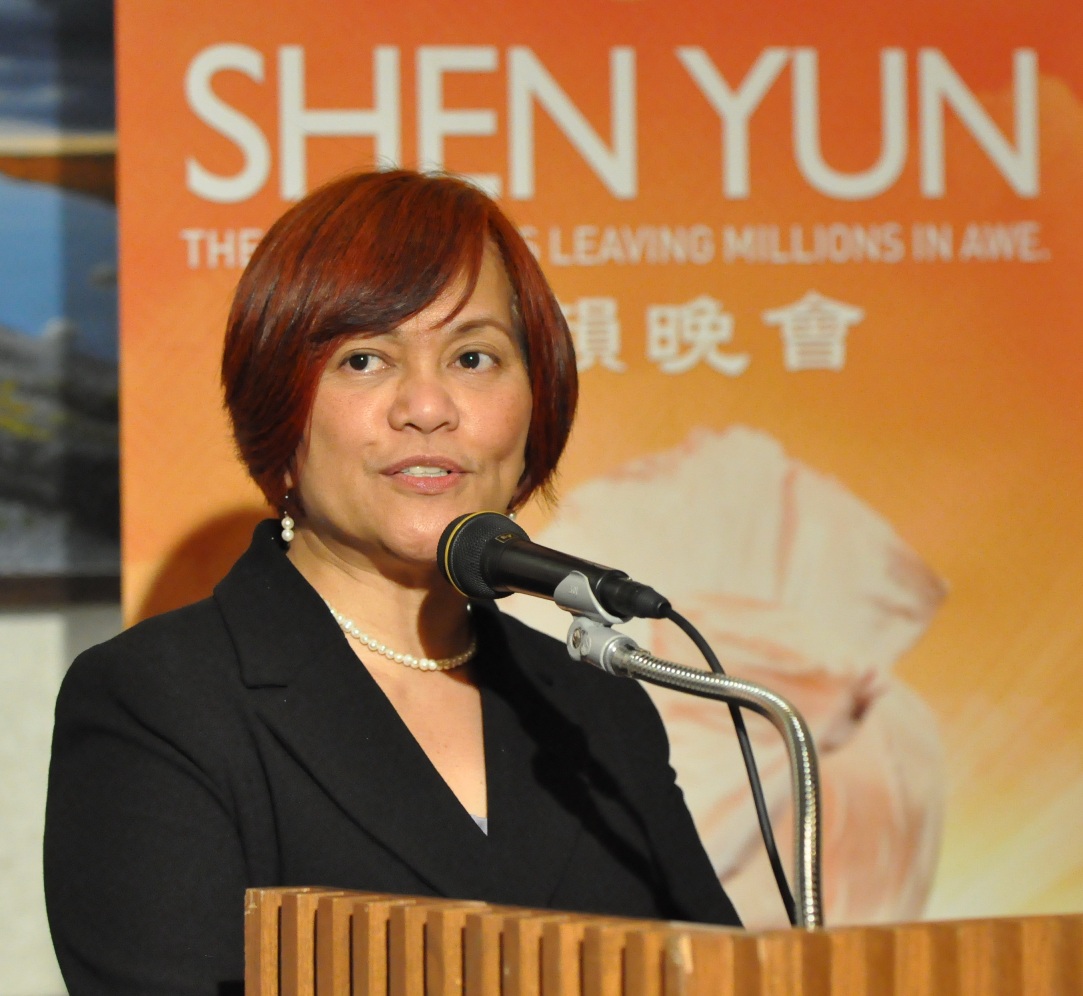 “神韵的音乐充满独特的中国风味,但在世界上每个角落、每个人的心里产生共鸣。舞蹈亦如是,无声的东方语言,但世界上每个角落、每个人都能理解。”她说,“她(神韵)是你不可错过的天赐良机。”
