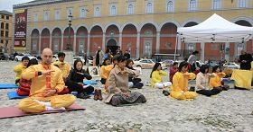 法轮功学员在慕尼黑王宫和国家歌剧院前的马克斯-约瑟夫广场(Max-Joseph-Platz)展示法轮功功法