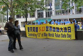 一位墨尔本当地老人一直在现场观看“5.13”庆祝活动,听完法轮功学员给其介绍中共仍然在暗中迫害法轮功,他义愤填膺地说:就是今天要停止镇压法轮功。