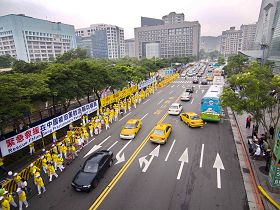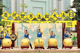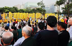 下午三点多,游行队伍由声势浩壮的天国乐团开路,用一首首庄严的乐曲告诉台湾民众大法在世界的洪传。接着笑容可掬的仙女队、小弟子腰鼓队和展示法轮功五套功法的炼功方阵都引起许多行人的围观与摄像。