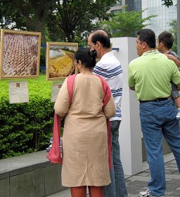 ![]() 路过的行人被法轮功真相图片展吸引 |