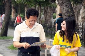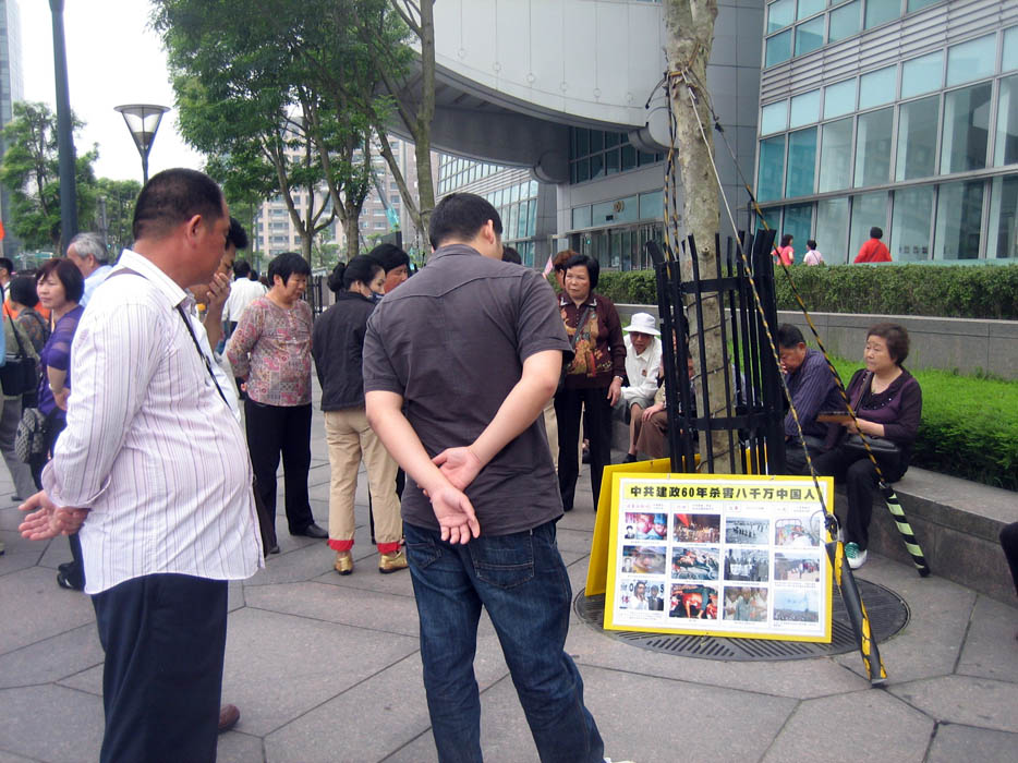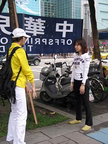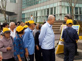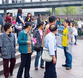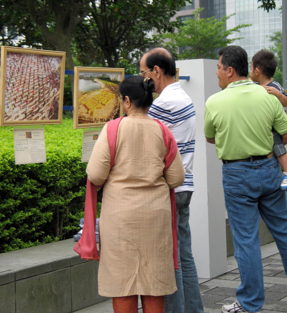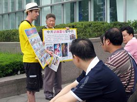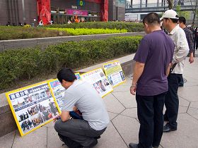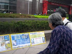 ![]() 大陆游客看着黄涵手上的法轮功真相展板 |