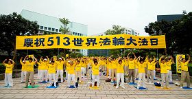 象往常一样,载着大陆游客到台北一零一大楼的游览车一辆接着一辆,许多游客一下车,隔着马路看到在“庆祝513法轮大法日”横幅下,上千个身着黄衫,祥和的炼着功的法轮功学员身影,许多人都情不自禁拿起相机,拍下了这难得的画面。