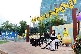 隆隆鼓声中,气势磅礴的新唐人旗鼓队揭开了今天活动的序幕。紧接着有明慧豆豆园小朋友精神抖擞的《洪吟》朗诵、小弟子飞腾旋转的手绢舞、美妙的乐器合奏、悠扬的男女合唱,和由来自各行各业法轮功学员所组成的天国乐团,场面温馨、热闹又祥和。