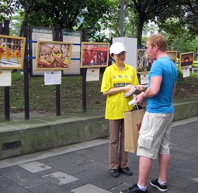 来自瑞士的一位先生向学员表示他知道法轮功很好,在世界各地都有法轮功,他很高兴在这里也能看到和听到法轮功,他与学员聊了好些时间,并且高兴地收下英文版的法轮功弘传世界的真相简介后才离开。