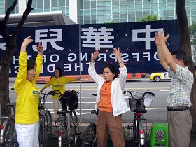 经由同事介绍,从中和赶来学功的傅小姐表示,很感谢同事的介绍,让她能有机会认法轮功,她觉的这是非常特别的缘份。虽然只是跟着教功的法轮功学员比划了一两套功法,但她感觉炼功让她非常舒服,她准备回去后要找个炼功点好好学功。