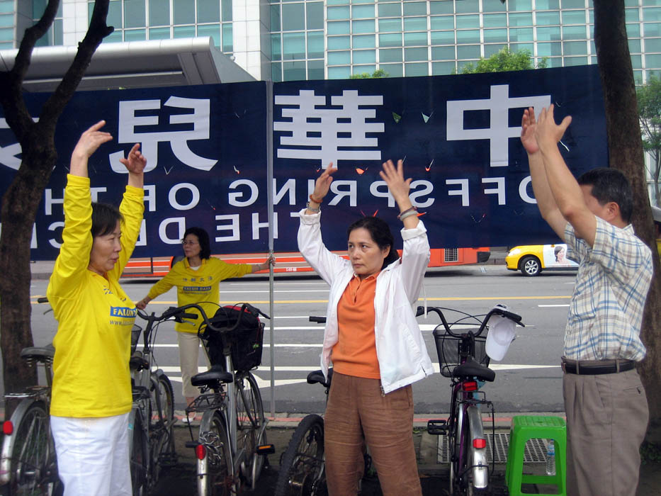 来自上海的四位观光客,趁着等候游览车的时候,特地越过马路来到信义广场学员集体炼功的场面前合拍照片,听到台湾同胞说:“唷,上海大都市,见的世面多。”王先生顺口回答:“哎,谈不上,谈不上。说见过世面,可没见过这样的场面(手指着学员集体炼功的场面),所以要拍照带回去纪念,一切就尽在不言中了。”