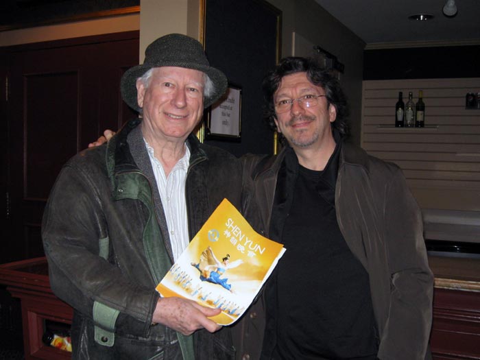 五月八日晚,加拿大获奖小说家英格尔(Howard Enge,左)与他的朋友、获奖电影演员托尼·纳迪(Tony Nardi)观看了神韵晚会