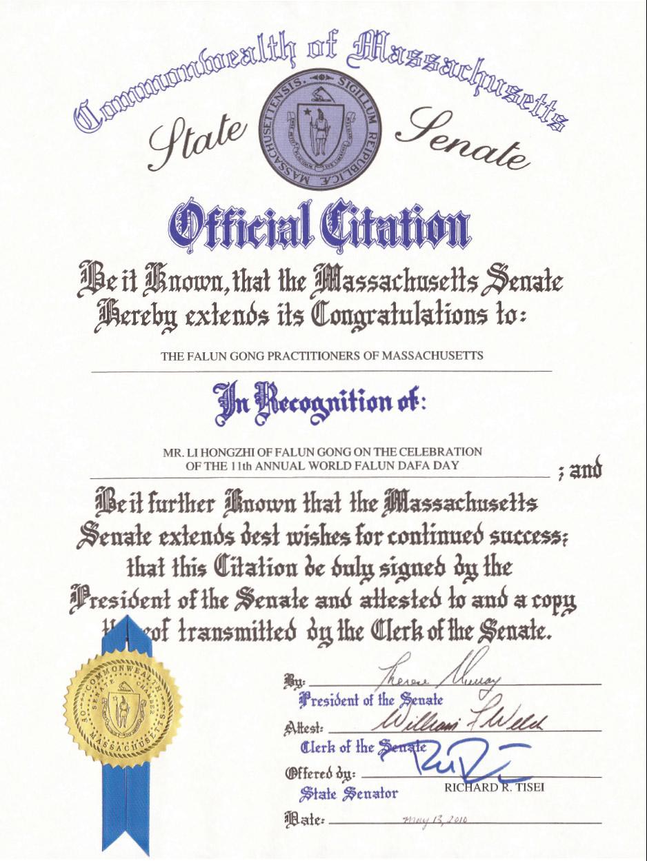 麻州参议院献上最美好的祝愿,祝不断取得成功。此褒奖状由参议院主席签署并由参议院秘书作证明和传递。