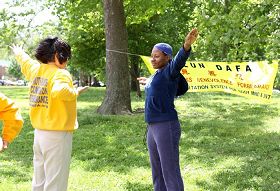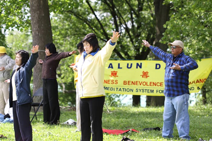周末的森林公园异常热闹,来往的很多行人驻足观看学员们的集体炼功和摆放在路边的早期中国大陆大型集体炼功的珍贵照片。法轮功,又称法轮大法,是以“真善忍”为根本指导,使修炼者能够返本归真的高层次修炼法门。一九九二年五月十三日,由李洪志先生在中国长春第一次把大法公开传出。如今,大法洪传一百一十多个国家和地区,载誉无数。亿万修炼者返本归真, 获益无穷。五月十三日被定为“世界法轮大法日”,以便全世界大法修炼者和善良民众共同欢庆。