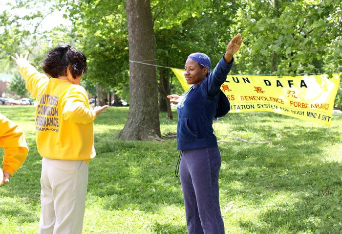 一个年轻女孩和她的叔叔看到森林公园里的集体炼功,立刻对功法表现了非常浓厚的兴趣,原来他们曾在电视上看到过法轮功的介绍短片。在听过学员的介绍后,年轻女孩当场就开始学功。