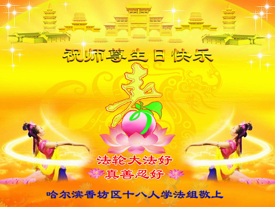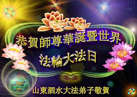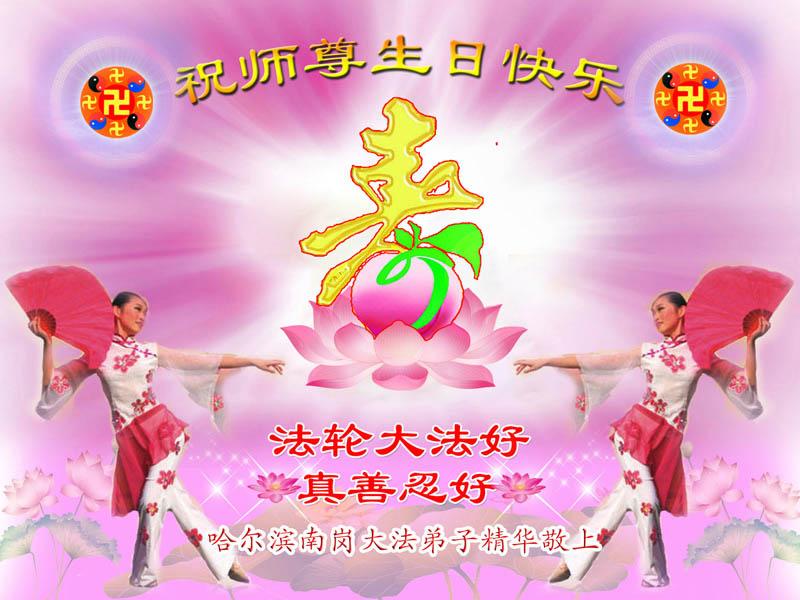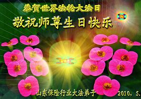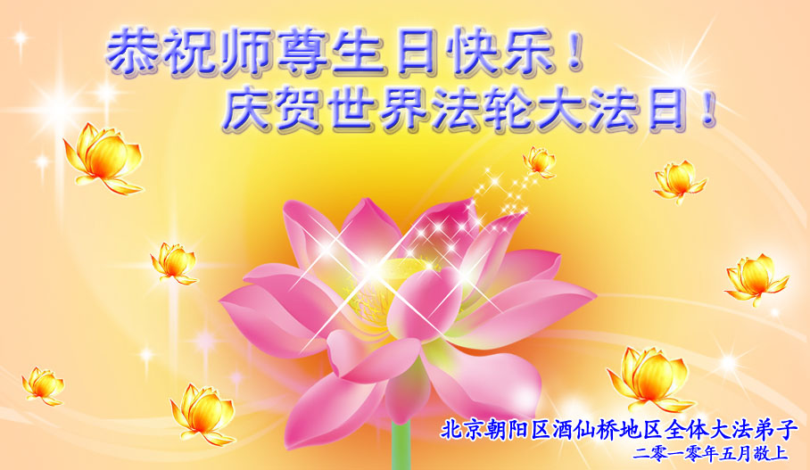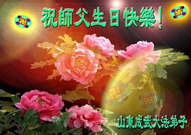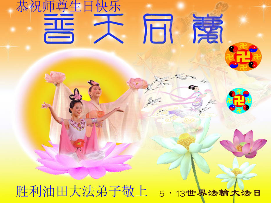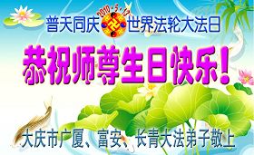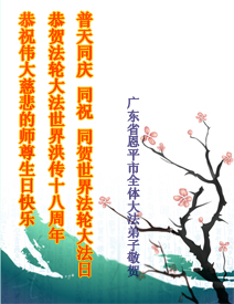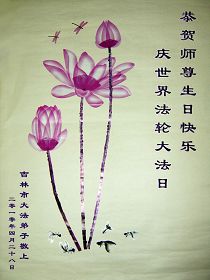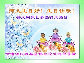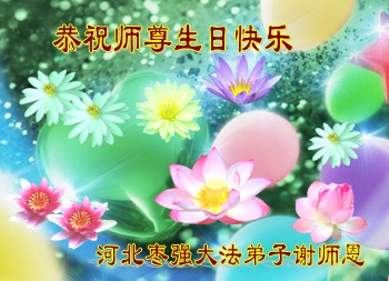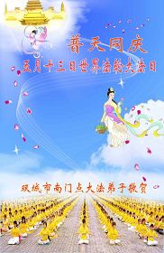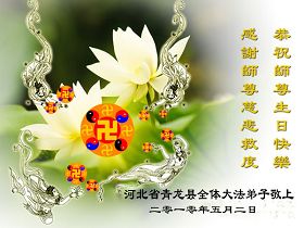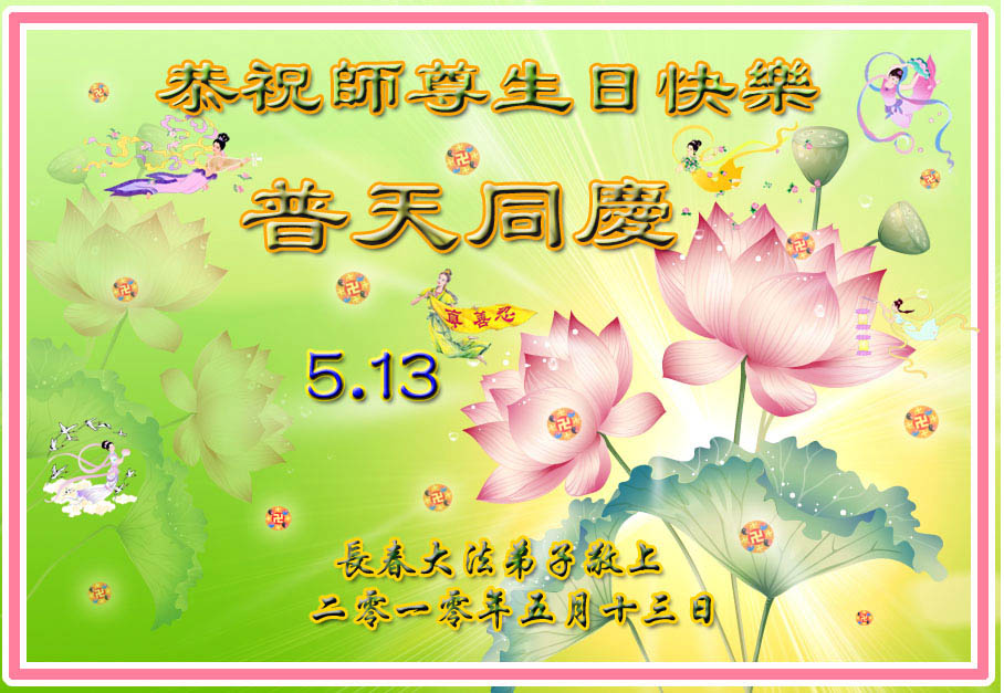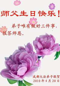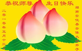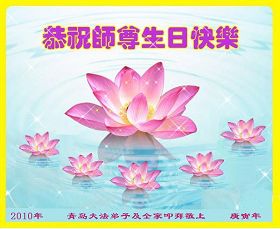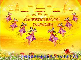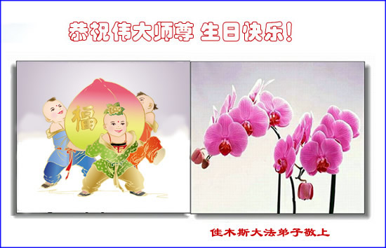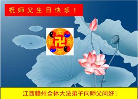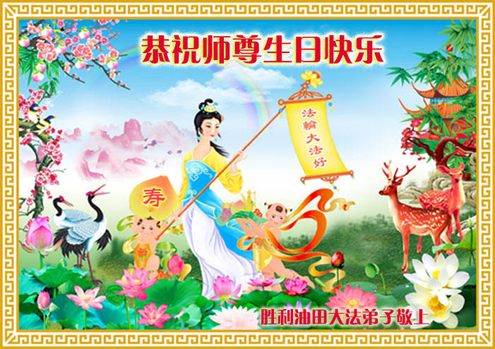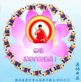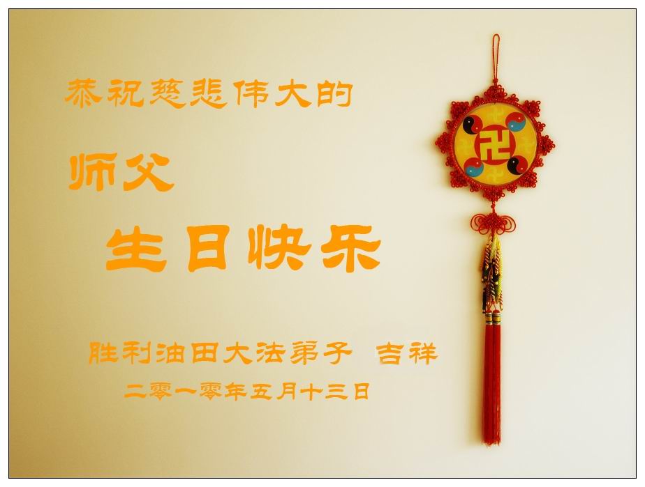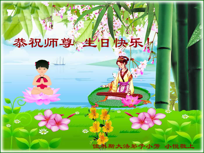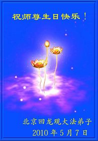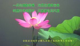 修炼法轮大法以来,师尊不仅给了我们健康的身体,还让我们懂得了人活着的真正目地和当前讲真相救人的重要性。师尊的恩泽一直沐浴着我们。在师尊生日之际,我们叩拜师尊:恭祝师尊生日快乐!请师尊放心,我们一定做好三件事完成史前誓愿,圆满随师还。