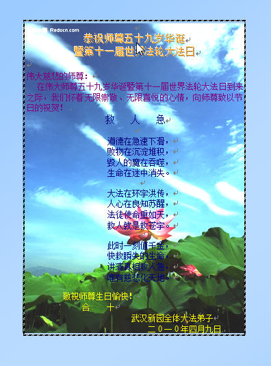 心敬祝师父生日快乐!我们无比感恩师父的慈悲救度,决心在修好自己的同时,让更多的世人明白真相,進入历史的新纪元!