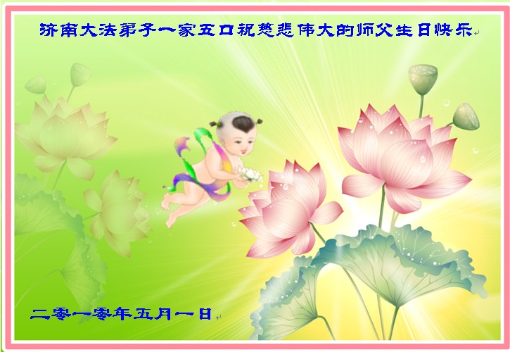 转眼间又迎来了慈悲伟大师尊的生日、慈悲伟大的师尊传法18周年纪念日和第11个世界法轮大法日。弟子全家五口怀着无比崇敬的心情恭祝慈悲伟大的师尊生日快乐!弟子们修的不好,三件事也做的很差,还有很多的众生没有得到救度,辜负了师父的慈悲厚望。弟子们会在最后的这段时间里精進起来,让师父少一点操劳,多一点欣慰。