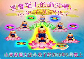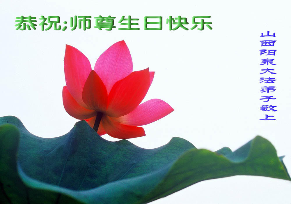 师尊您好!正法十一年了,您辛苦了!我们大陆大法弟子都非常想念您。在这值千金、值万金的时刻,我们阳曲大法弟子一定不负师尊的慈悲救度之恩,放下人心,圆容整体,做好每个弟子所肩负的使命,救度更多的众生,证实大法的伟大与美好。