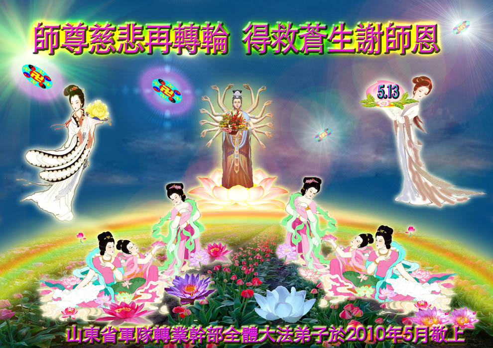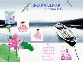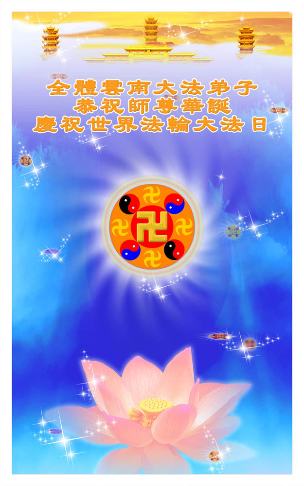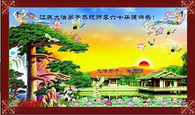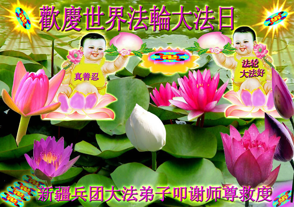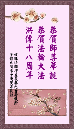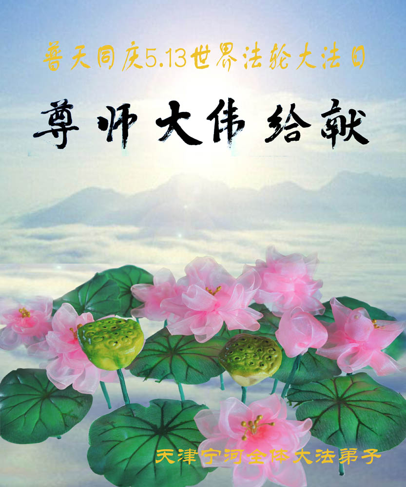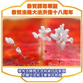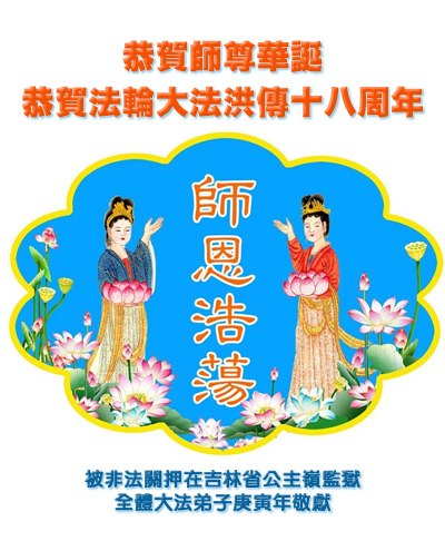 在这普天同贺师尊五十九岁华诞暨法轮大法洪传十八周年之时,我们回首得法十五年走过的历程,特别是邪党掀起的血雨腥风的十一年中,我们在浩荡的佛恩中一步步走到今天。在做好“三件事”中,我们深深体悟到“邪恶疯狂不迷途 除恶只当把尘拂”(《志不退》),佛法带给了我们心灵上的宁静、祥和。我们深知在这大穹巨变之际,我们距“正法时期大法弟子”的标准还相差很远,但是我们会用大法赋予我们的能力、智慧救度更多的世人,兑现史前大愿!此时我们更加思念伟大慈悲的师尊!