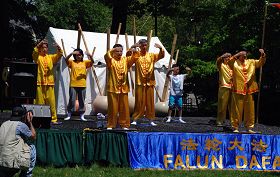 ![]() 明慧小弟子在费城动物园首届亚裔文化节上表演腰鼓“法轮大法好” |
