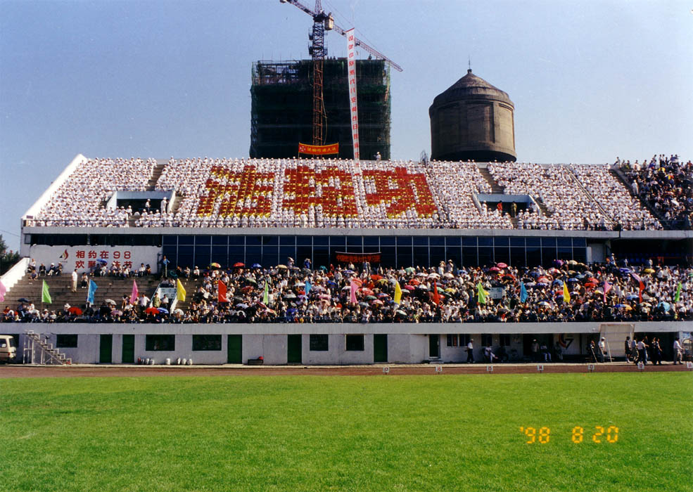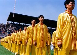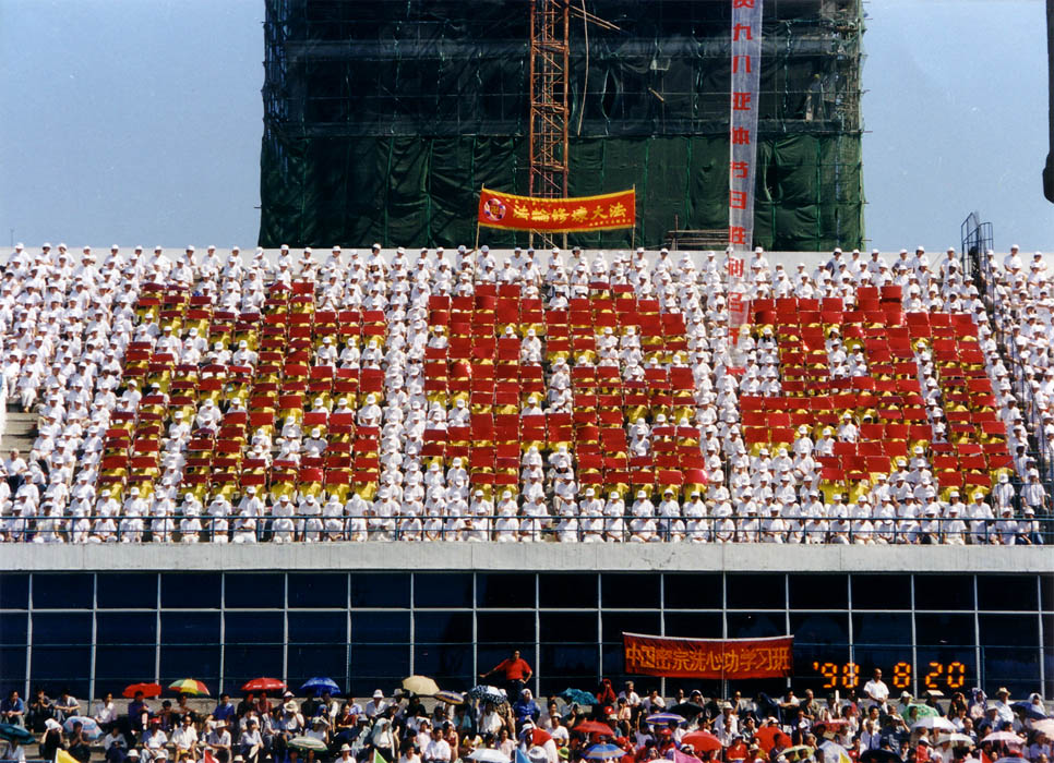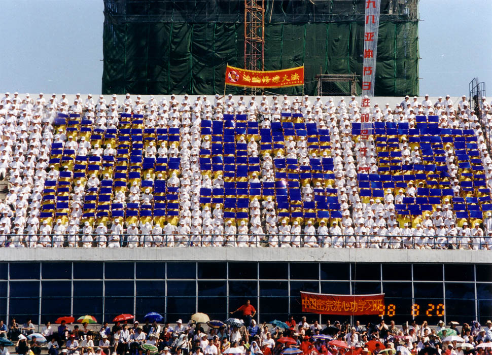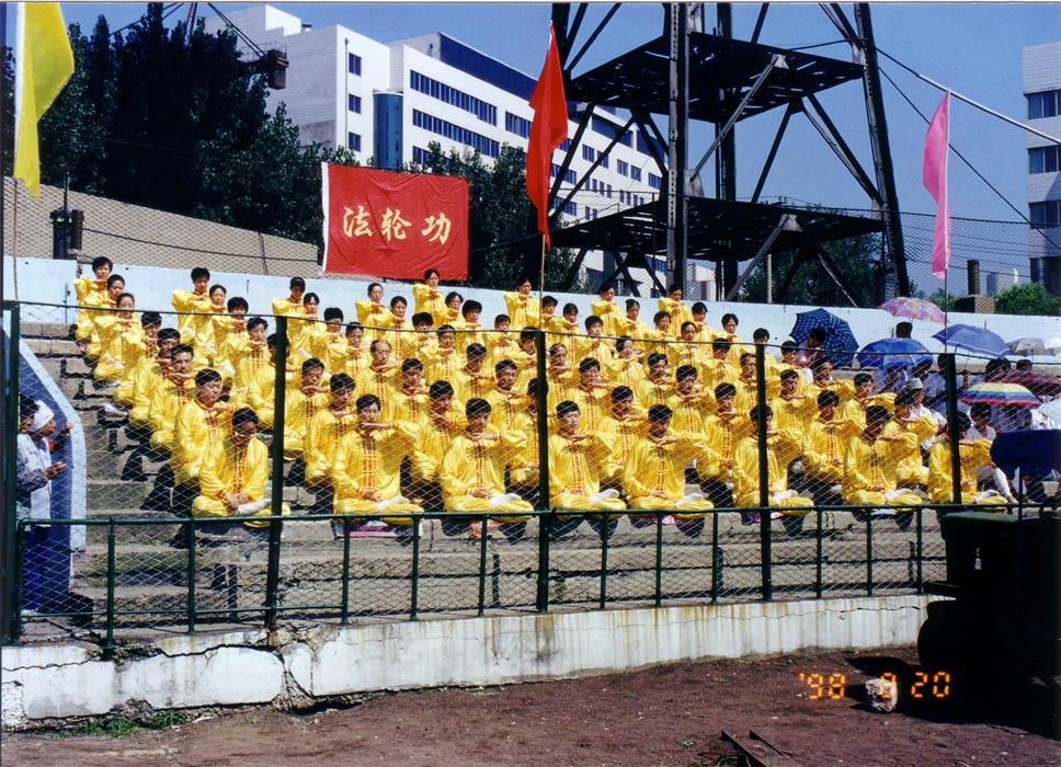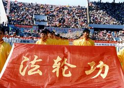 8月20日清晨大概5点多钟,我们就来到了体育场外,其他功法的人员也陆续来到。由于时间尚早,法轮功学员们就静静地站着等候,有的拿出随身携带的大法书籍读书,这与其它功法喧闹、兴奋的情景形成了鲜明对比。后来有学员组织大家集体炼功。大概7点左右,各功法作为观众的学员首先进入体育场,在看台上坐好,1500名法轮功学员排成了“法轮功”三个大字,壮观醒目。上午9时,开幕式正式开始,各功法代表队入场,并进行了功法表演。由几十名大法学员组成的法轮功方队穿着黄色的炼功服入场,并表演了舒缓优美的动功。退场后回到看台上,又接着表演了静功。开幕式共进行了6个小时,当时正值盛夏,烈日当空,大法弟子在水泥看台上始终整齐端坐,没人东倒西歪,没人交头接耳,没人随着走动,也没人大声喧哗。许多学员拿出随身携带的《转法轮》等大法书籍读书。多家媒体的记者纷纷到法轮功看台前拍照,有的记者还走上看台采访学员,许多学员谈了炼功后的受益情况。