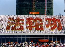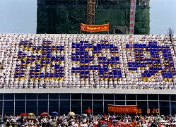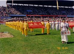 “观众席上1500人组成的法轮功观众队型令人赞叹,队员们头顶烈日,端坐6个小时.自始至终整齐威仪。走进法轮功的阵容,学员们热切地向我(记者)介绍炼功的收获,44岁的刘菊仙,因患股骨头坏死而卧床不起。痛不欲生。96年夏由姐姐介绍学炼法轮功后。坚持炼功,至今跑跳自如,入场式上脚步轻盈。