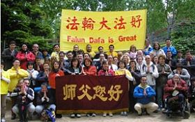 二零一零年五月十三日上午,瑞典法轮功学员聚集在斯德哥尔摩市中心国王花园举行集体炼功,庆祝第十一届“世界法轮大法日”,并恭贺法轮功创始人李洪志先生五十九华诞。