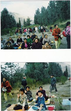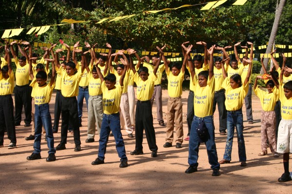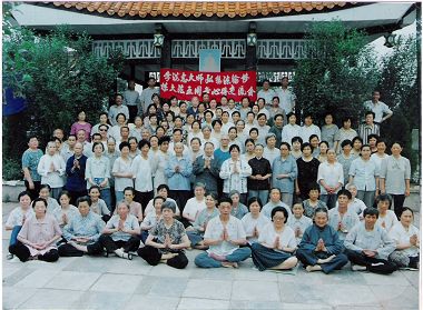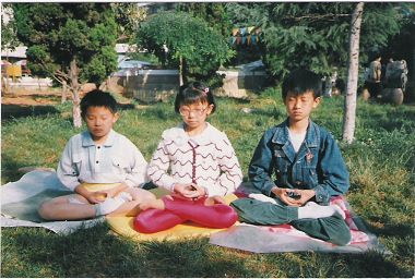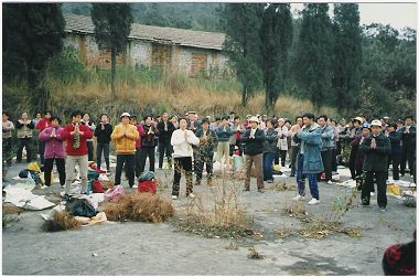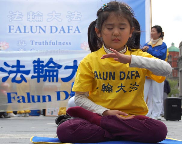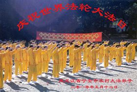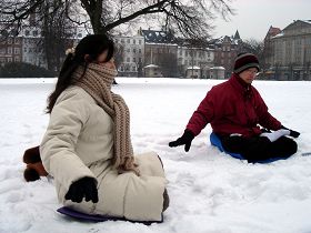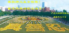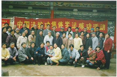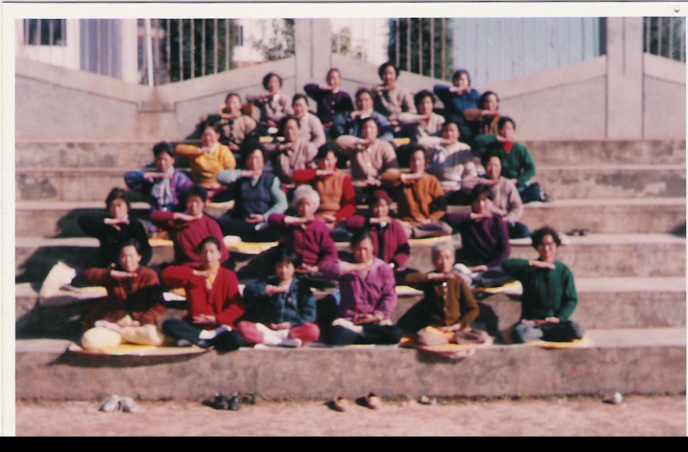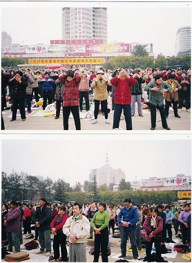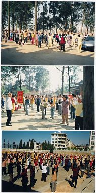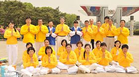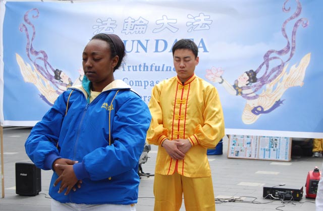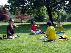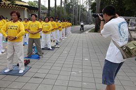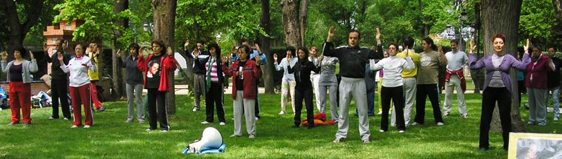 ![]() 法轮功学员在作法轮功的五套功法演示 |
