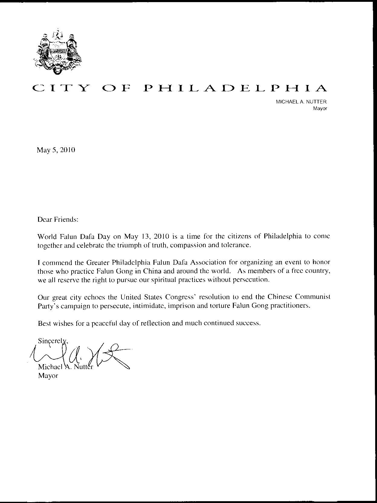 纳特市长在信中说,二零一零年五月十三日世界法轮大法日是费城市民欢聚一起庆祝真、善、忍取得辉煌的时刻。我赞赏费城法轮大法学会组织活动与中国和世界各地的学员欢庆节日。作为自由国家的一员,我们有权利在没有迫害的情况下追寻我们的信仰。