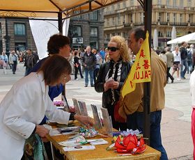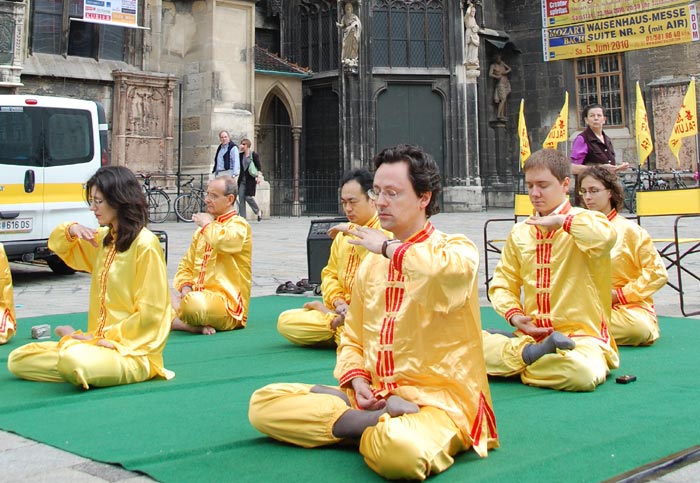 法轮功学员在维也纳市中心的史坦芬广场炼功