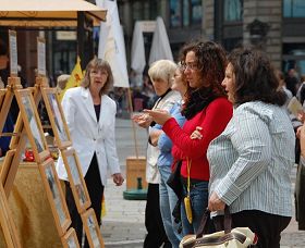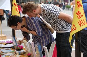 【明慧网二零一零年五月十四日】(明慧记者郑晴维也纳报道)二零一零年五月十三日,奥地利法轮功学员在维也纳市中心著名旅游景点史坦芬广场的大教堂前举行活动,庆祝第十一届世界法轮大法日,同时庆祝法轮功创始人李洪志先生五十九华诞。