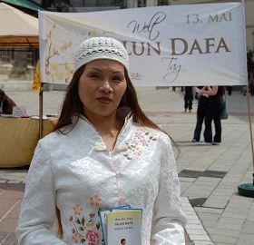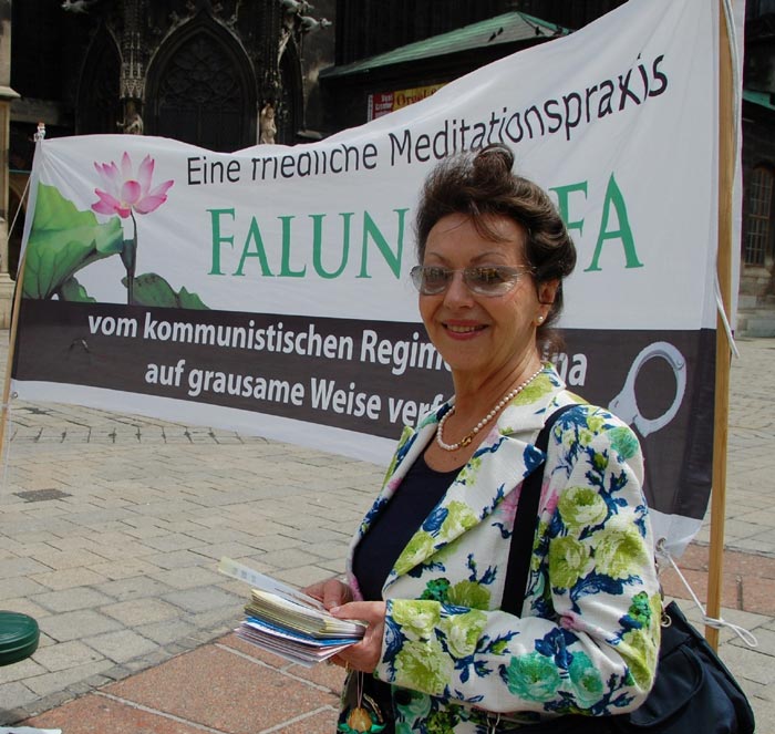 维也纳法轮功学员海尔冈(Helga ),是两年前开始修炼法轮功的。她告诉记者:“我原先也练过别的气功,但是后来我听说了法轮功,知道这是以‘真、善、忍’为准则的性命双修功法,无法用价值来衡量,其实这也是我一生要找的。而且人总是要回家的,法轮功给了我一条回家的路。从修炼以来,我的身体一直很好,没得过病。我告诉每个我认识的人关于法轮大法的美好,法轮功已经是我生活的中心,即使去健身房,我也告诉人们,关于法轮功在中国的被迫害。希望这场迫害早日结束 。”