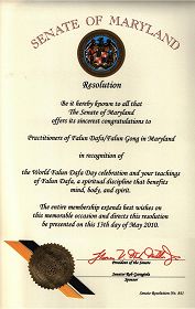 马里兰州参议院向马里兰州法轮大法/法轮功学员致以忠诚的祝贺,表彰世界法轮大法日庆祝活动以及对身体、精神与心灵都有益的法轮大法功法。