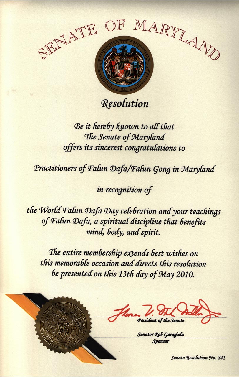 马里兰州参议院在同一天还通过了八四一号决议案,祝贺马里兰州法轮大法学员,表彰法轮大法日以及有益身心的法轮大法功法。