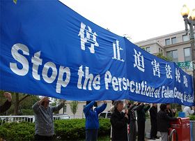 ![]() 中美人权对话期间,法轮功学员在美国国务院前呼吁制止中共迫害。 |