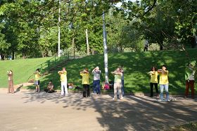 和举行了和平的抗议活动,纪念世界法轮大法日十一周年,抗议中共镇压法轮功,并沉痛悼念在无辜镇压中去世和被活摘器官的学员。