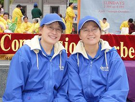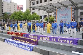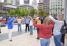 旧金山是著名的国际都市,位于市中心的联合广场不仅是购物中心的繁华地带,也是著名的旅游点。五月十五日上午九点半,当法轮功学员开始在联合广场中心的舞台演示功法的时候,很多民众被祥和的炼功场面所吸引,驻足观看。他们有的是本地居民,也有不少是来自欧洲、美国其它城市的游客。他们有的跟学员进一步了解什么是法轮大法,有的马上学习功法,更有来自中国大陆的民众在了解到中共的邪恶后,声明退出中共邪党组织。