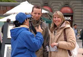 来自美国罗得岛(Rhode Island)的布鲁诺夫妇被祥和的炼功场面所吸引,两人微笑着驻足观看了很久。在旁的法轮功学员告诉他们,这就是法轮功,亦称法轮大法,是以“真、善、忍”为原则、提高人们心性的功法。他们表示,看起来非常祥和。当他们得知中共残酷迫害中国的法轮功学员,并活体摘取他们的器官盗卖时,他们表示,他们了解共产党从来都是杀人不眨眼的。