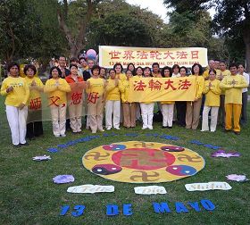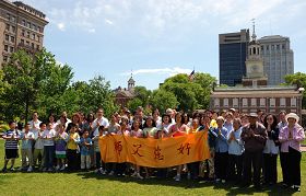 二零一零年五月十五日上午,费城法轮功学员在自由钟广场前的草坪上以集体炼功、分享修炼体会的方式庆祝世界法轮大法日,表达对师父的感恩。