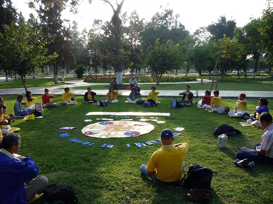 ![]() 秘鲁法轮功学员在公园集体炼功 |